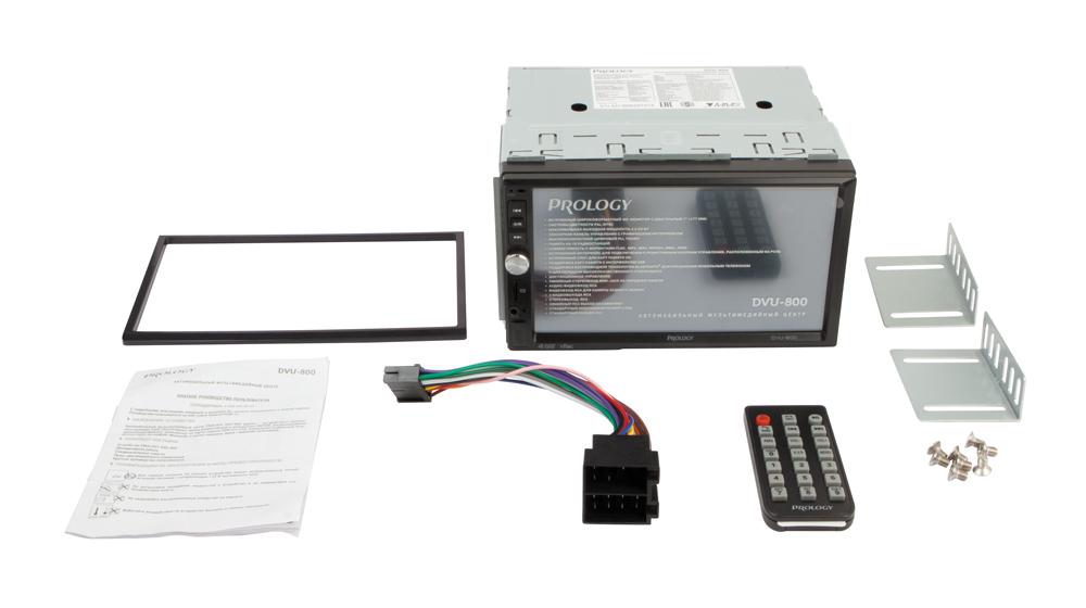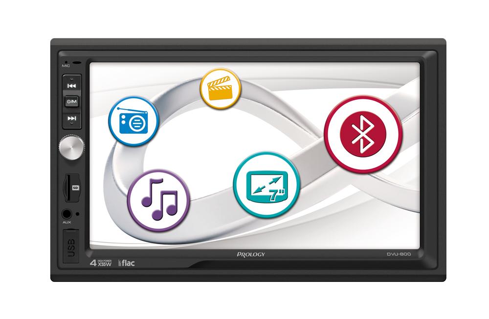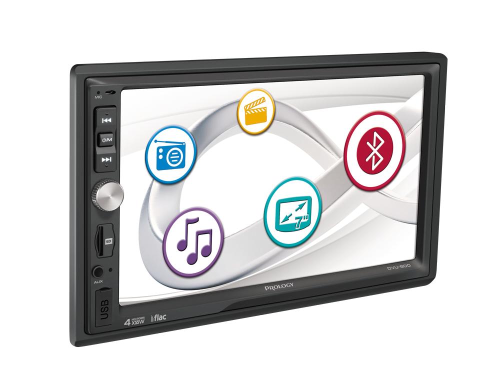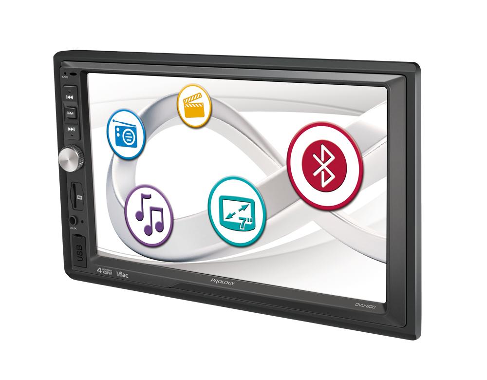 Prology DVU-800 монтажного размера 2DIN обеспечивает прием радиостанций в диапазонах FM/УКВ, воспроизведение аудио/видеофайлов, записанных на карты памяти USB/microSD; управление мобильным телефоном через интерфейс Bluetooth; а также передачу звука с других внешних источников.