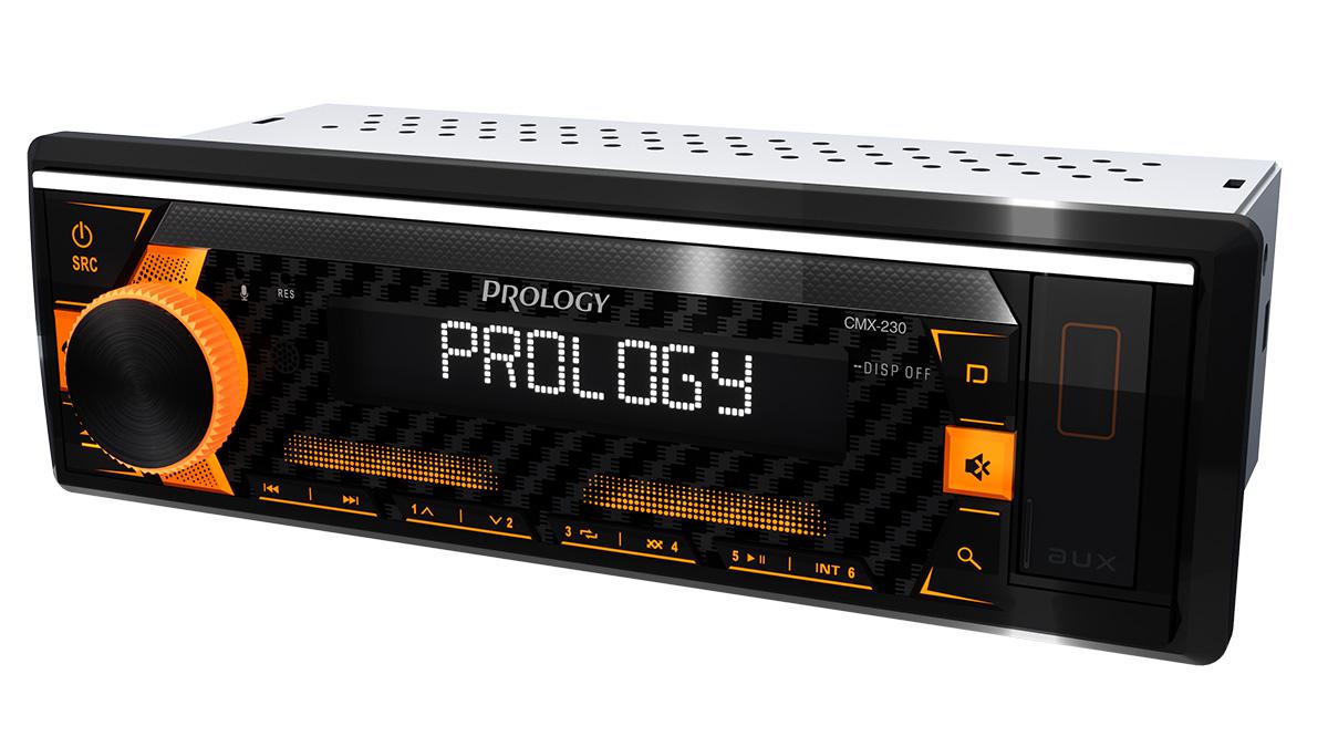 PROLOGY CMX-230 — FM / USB ресивер с Bluetooth®, стандартного размера 1DIN, который обеспечивает прием радиостанций в диапазоне FM и воспроизведение медиафайлов MP3, WAV, и FLAC форматов, записанных на USB накопители, передачу звука с внешних источников через линейный аудиовход и беспроводной интерфейс Bluetooth. Поддерживается управление мобильным телефоном через интерфейс Bluetooth® (ver. 4,2).
