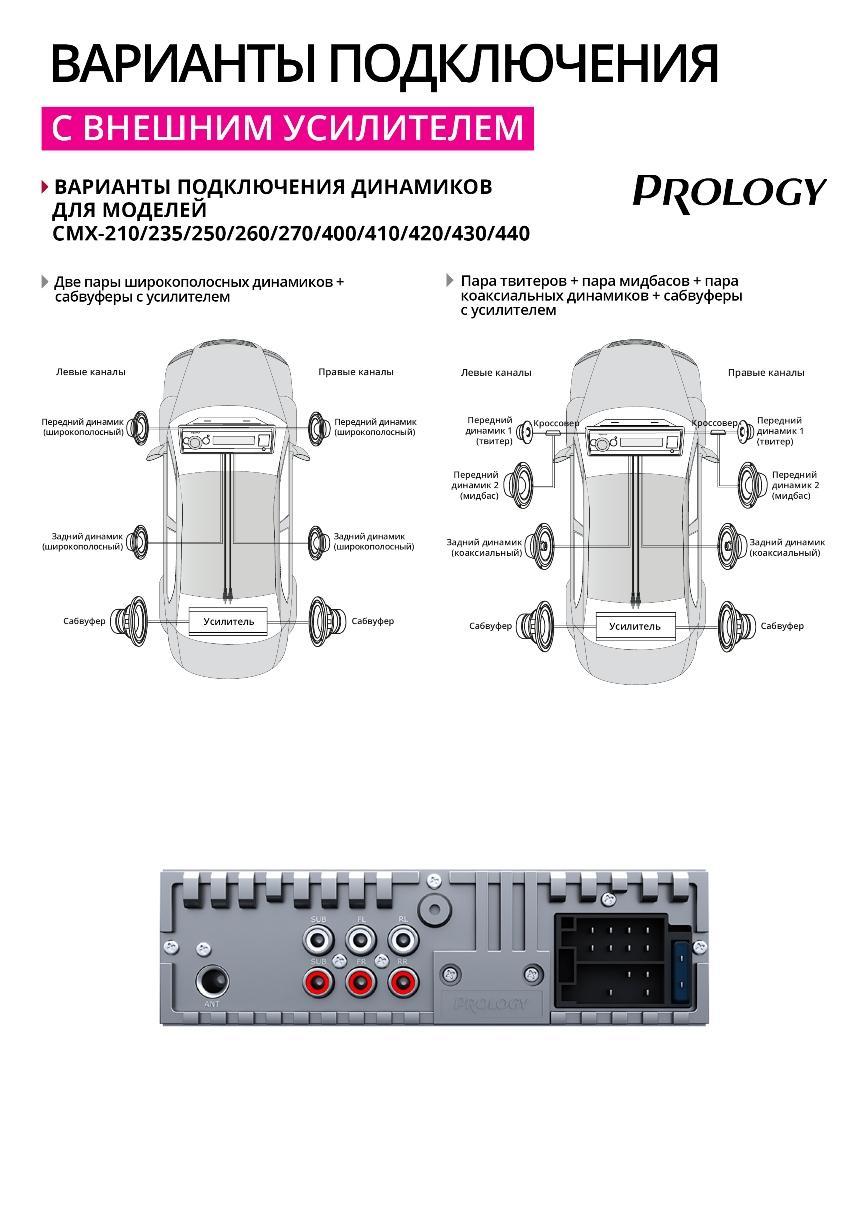 Автомагнитола PROLOGY CMX-400 предоставляет широкие возможности для построения в автомобиле развитой аудиосистемы. Для подключения дополнительных внешних усилителей предусмотрен 4-канальный линейный аудиовыход RCA, а также 2 выхода RCA для подключения сабвуфера.
